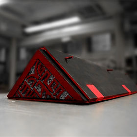 The hanging scroll has a container that was created especially for this purpose. The form and method for closing the box is designed for holding the scroll. Both the container and the banner used the sealing method. The interior of the box is a series of black, white and red stripes, which are the same elements used in the scroll.