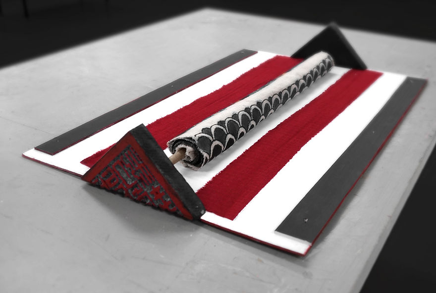 As a group of highly individual and different beings, we have more in common than we have things that separate us. Examples of symbolic and color “emblems” exist in every culture, ethnic group, social organization, etc. This final problem is an exploration of the self, placed within the context of the public. The motifs and colors share many cultural references. A viewer may see not only Chinese patterns, but also Inuit and Native American tradition, such as the diamond shape in red and brown. The use of material is very simple but also very sophisticated. The eye is fooled to believe that the composition is woven when it is actually painted and cut. It is the same as John Berger mentioned in Ways of Seeing: "The relation between what we see and what we know is never settled.”